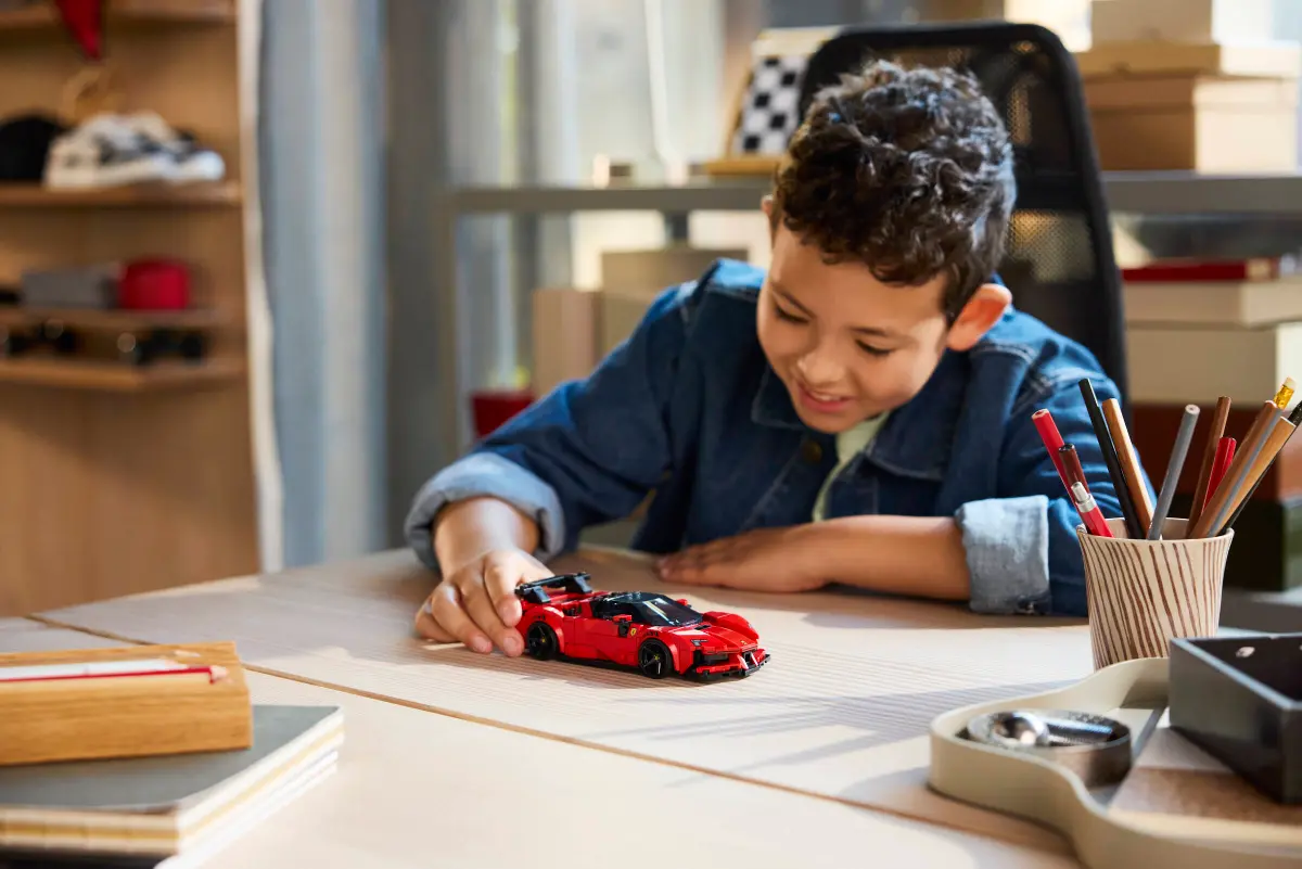 ילדים וילדות בגיל 9 ומעלה יכולים לבנות, לשחק ולהציג את הדגם (77254) מכונית ספורט Ferrari SF90 XX Stradale מסדרת LEGO® Speed Champions.